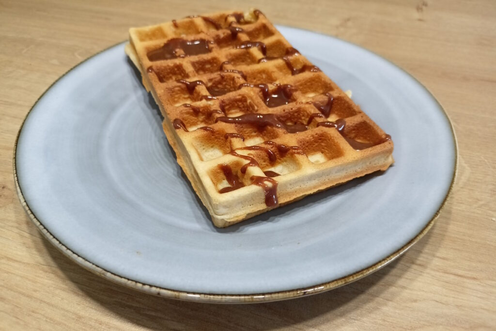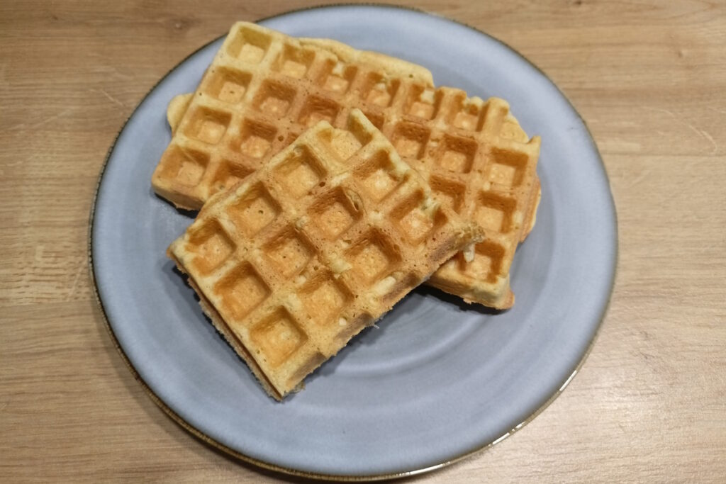 Cukier nie tylko słodzi, ale przede wszystkim karmelizuje się podczas pieczenia. To właśnie dzięki niemu gofry zyskują chrupiącą „skorupkę” i piękny, brązowy kolor. Erytrytol i inne alkohole cukrowe nie karmelizują się tak dobrze. Gofry mogą być przez to bledsze i mniej chrupiące. Słodzidła płynne (syrop klonowy, miód) dodają ciastu wilgoci, przez co gofry mogą wyjść nieco bardziej miękkie.