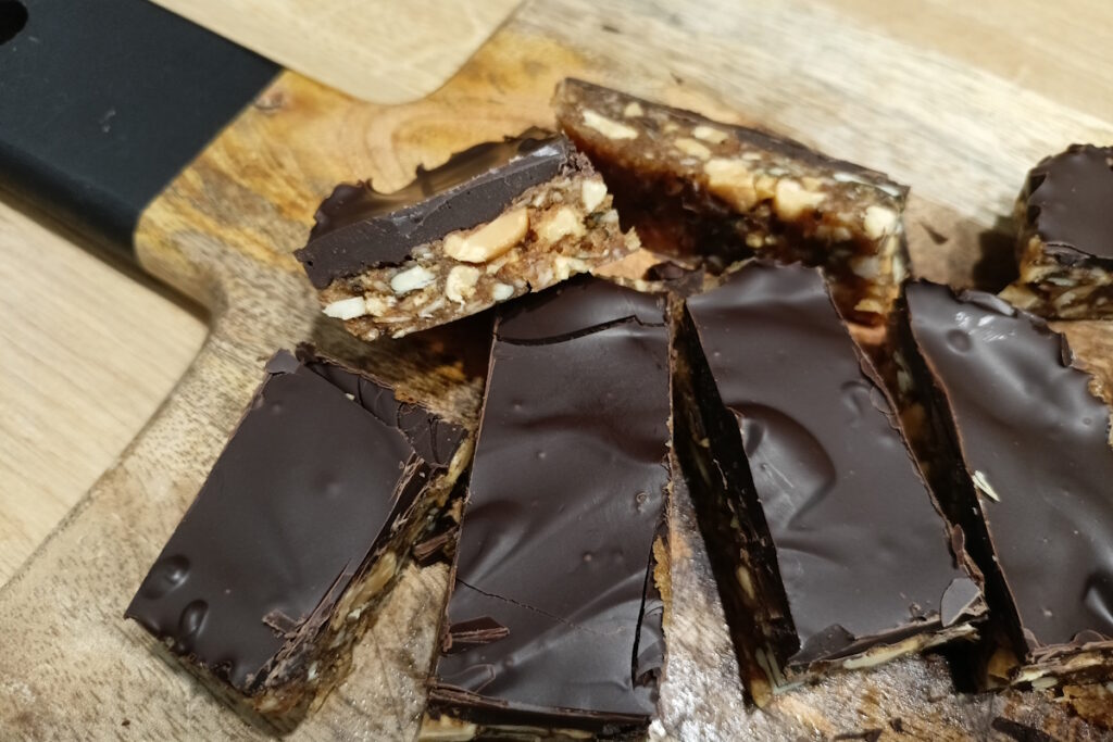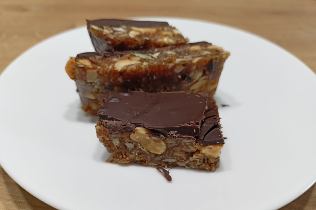 Najprostsze domowe „Snickersy”, które łączą słodycz daktyli, chrupiące orzechy i czekoladę – bez cukru i bez glutenu. Idealne jako zdrowa przekąska, szybki deser lub energetyczny baton do pracy i na trening.