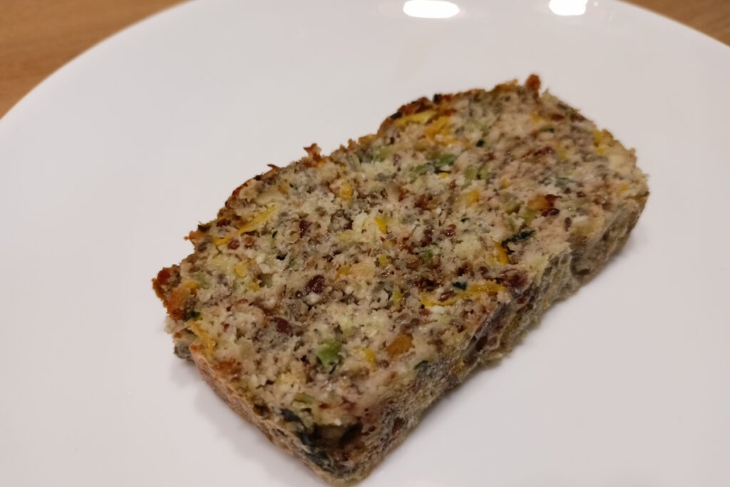 Poprzedni wypiek – keto chleb z chia z ziarnami bez glutenu był bardzo zbity. Ten z cukinią ma bardziej kruszącą się strukturę, charakterystyczną dla wypieków z mąką migdałową.