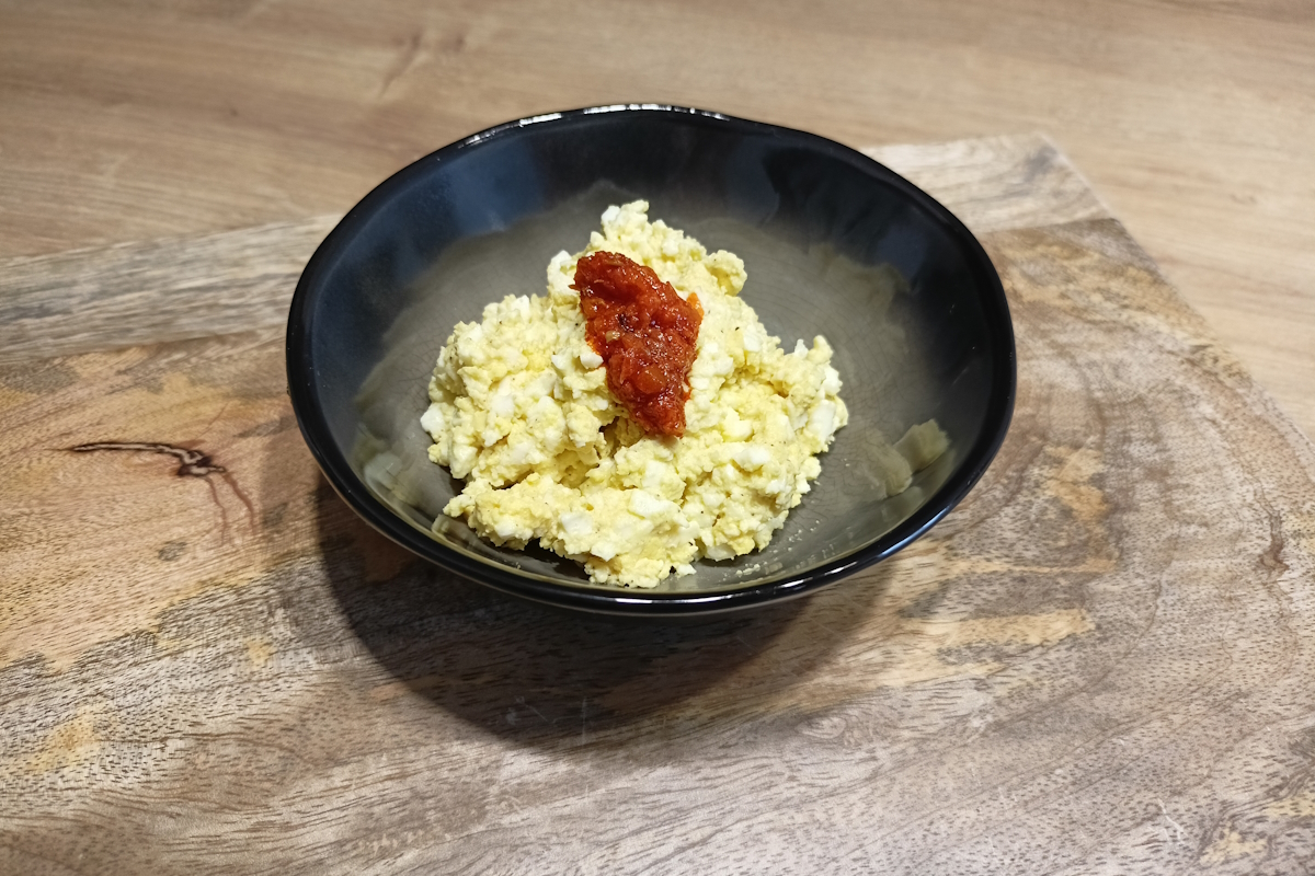 1. Ugotowane jajka rozdrobnij widelcem, mieszając z resztą składników. Jeśli masz ochotę na mocniejszy smak, dodaj więcej musztardy.
