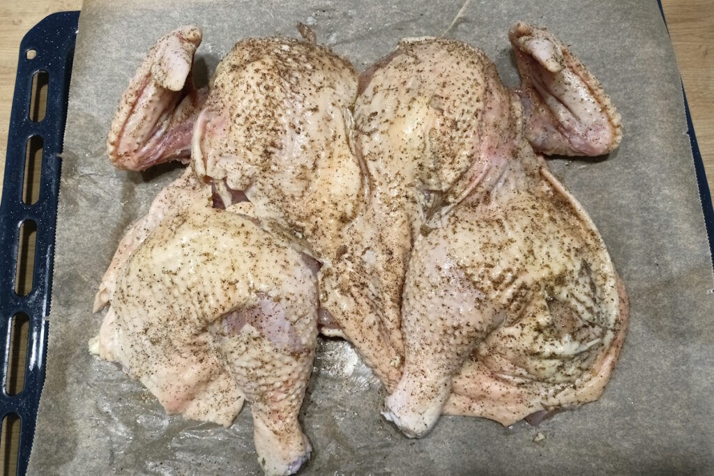 3. Natrzyj kurę pieprzem i odrobiną oliwy, ułóż na brytfance.