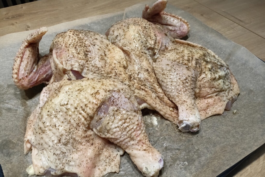 Moja kura była domowa i dorodna (2,4 kg). Przed marynowaniem została wyluzowana z kości korpusu (rozcięłam ją od strony pleców, wykrawając delikatnie kości tuszki), udka i skrzydełka zostawiłam.